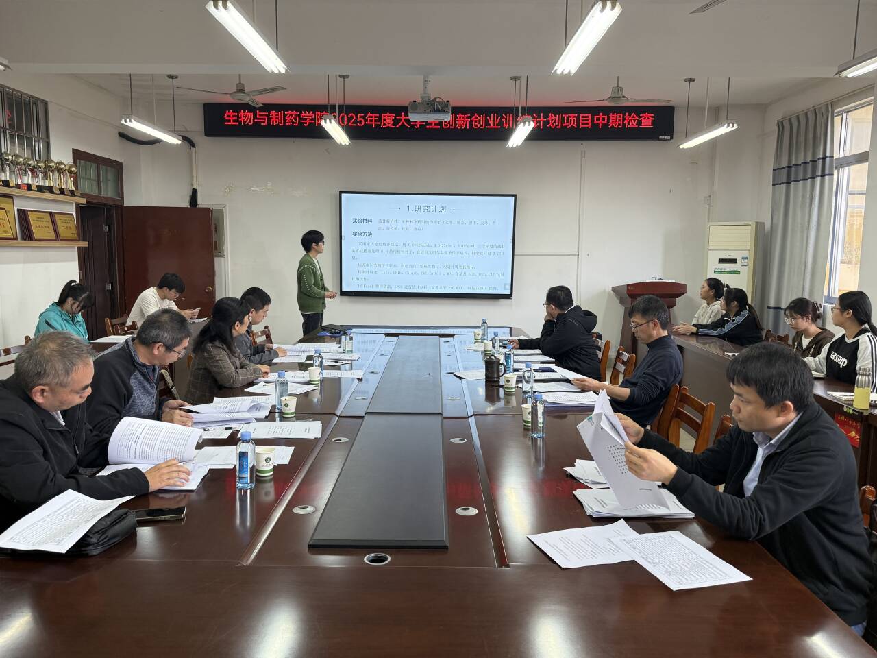 12月17日上午,生物与制药学院在我校东校区格物楼BA405会议室开展2025年大学生创新创业训练计划项目中期检查工作。本次会议由该院院长贝永建、副院长王小敏,教师李桂芬、曾国芳、林谦、李海东、张克处担任评委,20个项目团队负责人进行答辩。